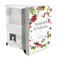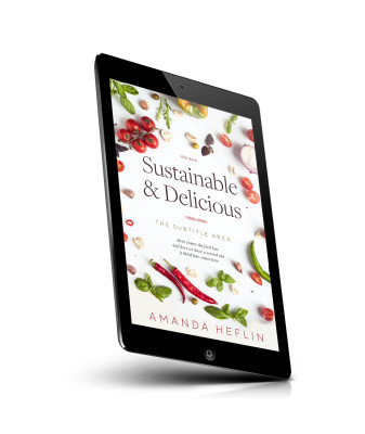 “An assortment of fresh vegetables and herbs surrounding a book title on a white background.”
