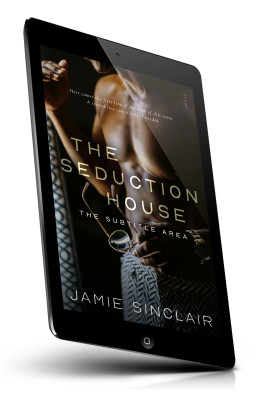 “A shirtless person holding glasses stands near a patterned curtain, with text overlay regarding "The Seduction House" by Jamie Sinclair.”