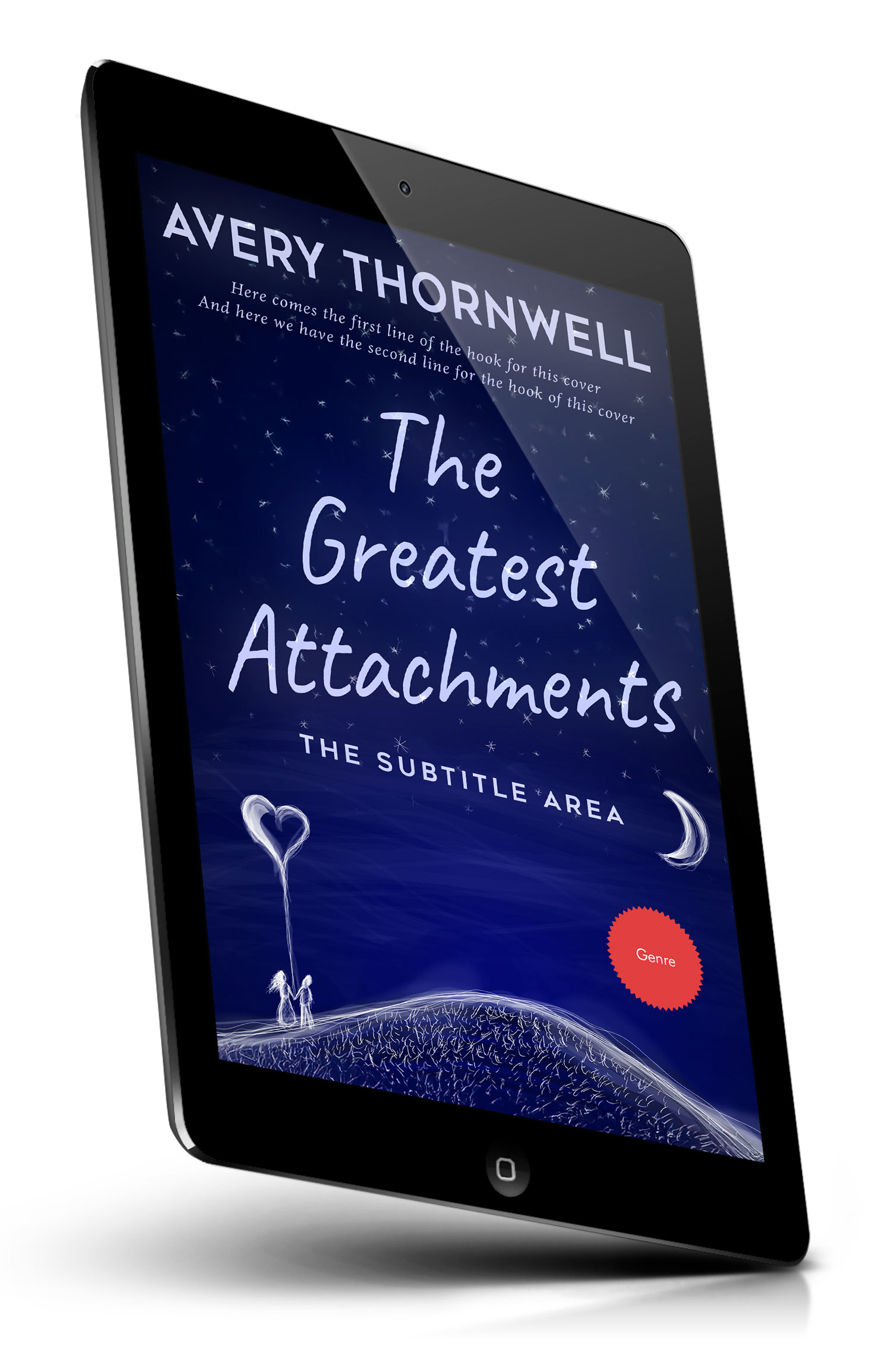 “Starry night book cover with handwritten-style title, a crescent moon, and two figures on a hill holding a heart-shaped balloon.”