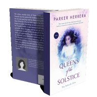 “A serene woman in a white dress lies in a wintry, mystical setting surrounded by ice and snow. Purple and blue tones dominate the cover.”