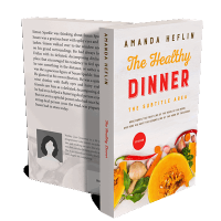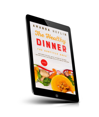 “A book cover with vibrant vegetables at the bottom, titled "The Healthy Dinner," featuring bright orange and red text.”