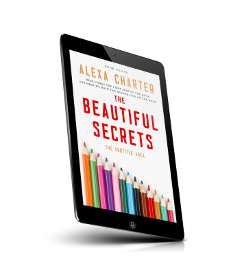 “A collection of colored pencils arranged in a row, below a book cover with bold red and black text.”
