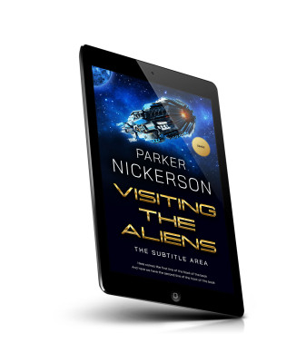 “A spaceship floats in a starry space background above futuristic gold text detailing a book by Parker Nickerson titled "Visiting the Aliens."”