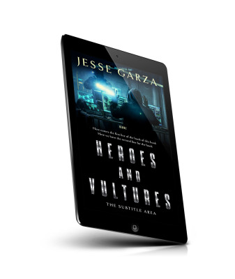 “A person in a dark room works on multiple computer screens with a world map on one. The text reads "Heroes and Vultures."”