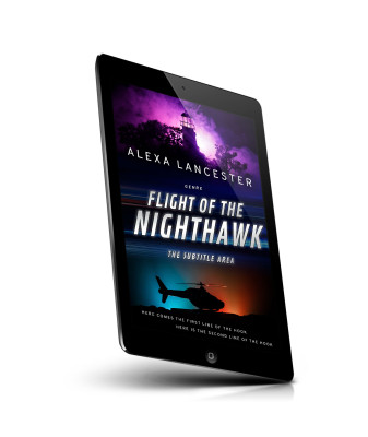 “A lighthouse in a purple sky above a helicopter flying in a darkened sky with sun setting, with the title "Flight of the Nighthawk".”