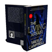“A hooded figure shrouded in dark blue shadows with bold yellow text overlay for "The Living Affair" and author's name "Breslin Campbell."”