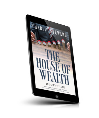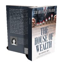 “A person in a suit arranging small house models on stacks of coins, featured above the title "The House of Wealth."”