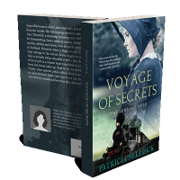 “A woman in a bonnet side profile, with a vintage train below, moving on tracks through a grassy area.”
