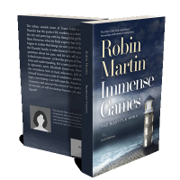 “Cover with a lighthouse against a cloudy sky and ocean background. Large text with multiple lines.”