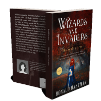“A book cover with a fantasy theme featuring a woman in a blue dress holding a sword in a mystical forest.”