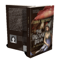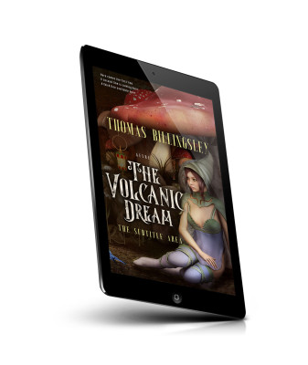 “A fantasy-themed book cover depicting a woman in a mystical outfit with a large mushroom and forest in the background.”