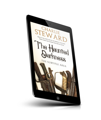 “A book cover featuring the title "The Haunted Darkness" with various antique swords and daggers in the lower half. ”