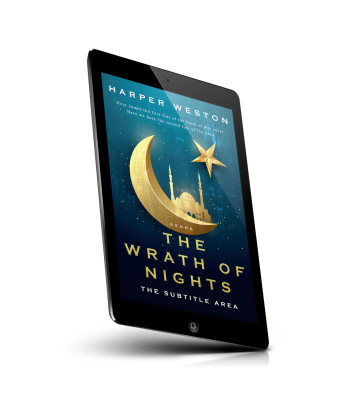 “Book cover with a mosque, golden crescent moon, and star against a starry blue background.”