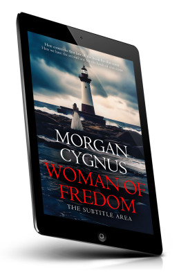 “A woman in a white dress stands on rocks facing a lighthouse under a dark, cloudy sky.”