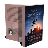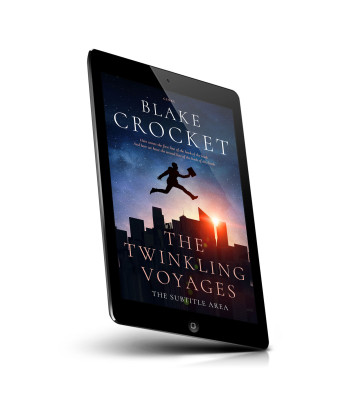 “A silhouette of a person leaping over a city skyline at sunset, with a book in hand, beneath a starry sky.”