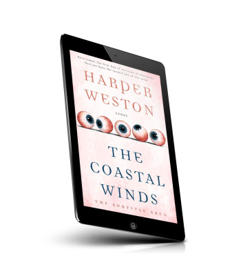 “A book cover with five eyeballs in a row on a pinkish background. Title in large blue text, author name in large red text above.”