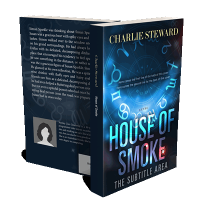 “A blue and black mystical cover featuring a zodiac circle and the title "House of Smoke".”