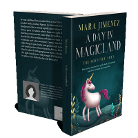 “A whimsical book cover featuring a pink and white unicorn with a golden horn, surrounded by colorful plants on a dark background.”