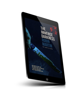 “A hand holding a blood-smeared knife against a dark background.”