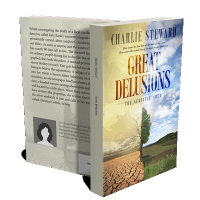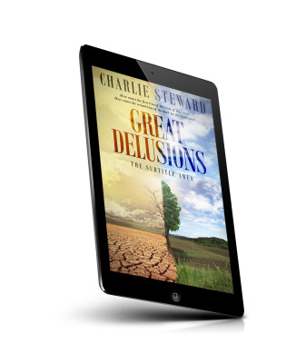“A tree divides a cracked desert and a green field under a dramatic sky.”