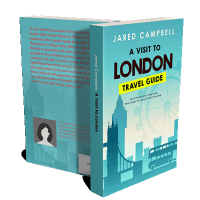 “A travel guidebook cover with London landmarks and a bus, featuring bold text and a Ferris wheel illustration in the background.”