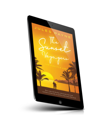 “Silhouetted couple by palm trees, vibrant orange sunset with a sun setting over the ocean.”