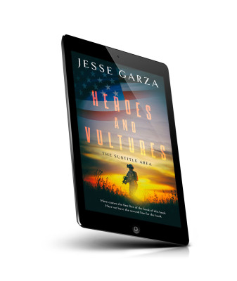 “A soldier stands in a field at sunset, beneath an American flag with the title "Heroes and Vultures."”