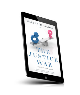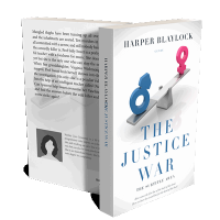 “A seesaw with male and female symbols in balance; title reads "The Justice War", author is Harper Blaylock. Clean, minimalist design.”