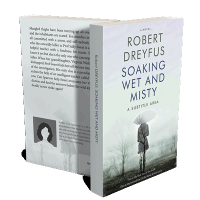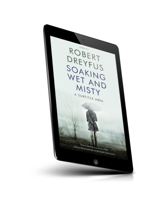 “A person with an umbrella stands in a foggy landscape with bare trees, set against a minimalist book cover design.”