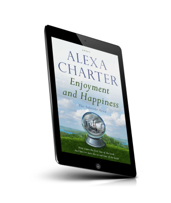 “A book cover with a serene landscape and a crystal ball showing an industrial scene. The sky is cloudy.”