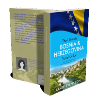 “A guidebook cover with a scenic view of Mostar in Bosnia & Herzegovina and a flowing national flag at the top.”