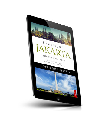 “The image shows a book cover with photos of a city skyline and a monument, featuring the title "Beautiful Jakarta".”