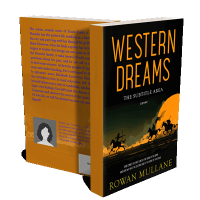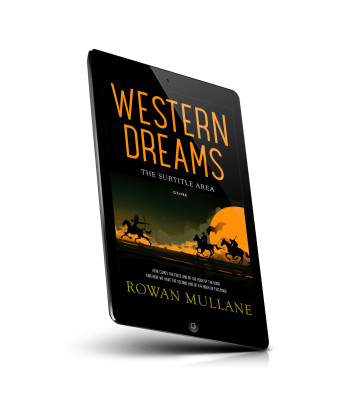 “Silhouetted cowboys on horseback ride against an orange sunset with bold, large text above them.”