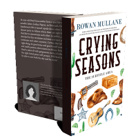 “Western-themed items like a revolver, cowboy hat, boots, guitar, and a stack of hay surround the title "Crying Seasons."”