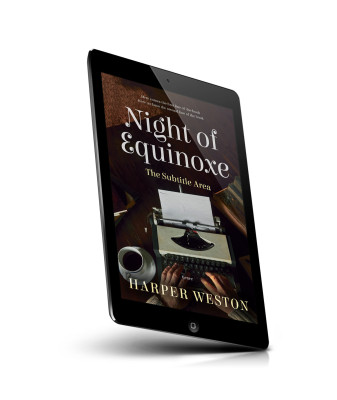 “A person types on a vintage typewriter beside a cup of coffee and open books, with "Night of Equinoxe" prominently displayed above.”