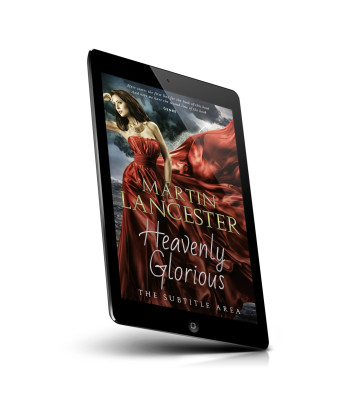 “A woman in a flowing red dress stands against a stormy, dramatic background. The text highlights a book title and author name.”