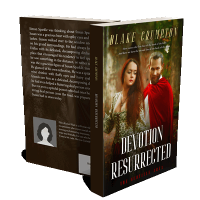 “A man and woman in historical attire stand closely together in a wooded area, looking in opposite directions.”