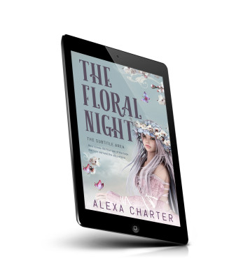 “A woman with white hair and a floral crown stands amidst delicate flowers and butterflies, set against a serene backdrop.”