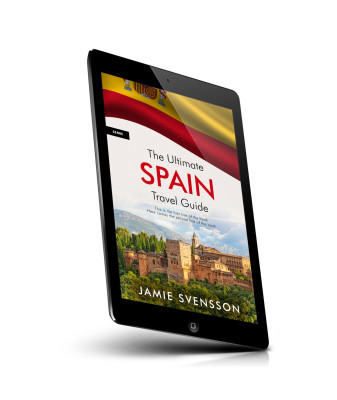 “A travel book cover featuring a Spanish flag and a scenic view of a historic building surrounded by greenery and mountains.”