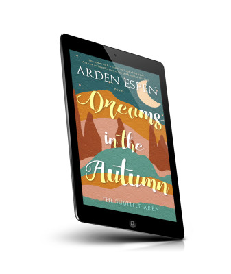 “Abstract landscape with mountains and a crescent moon, featuring yellow and white text in a decorative style.”