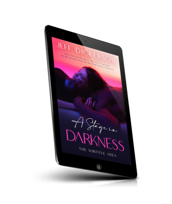 “A couple embracing tenderly under pink and purple lighting with a book title "A Stage in Darkness."”
