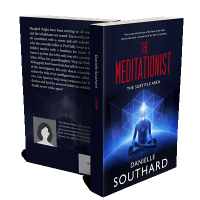 “A figure in a meditative pose sits within glowing geometric shapes on a dark, mystical background.”