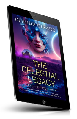 “A futuristic sci-fi book cover featuring a cyborg face, otherworldly landscapes, and a distant city under a purple sky with planets and moons.”