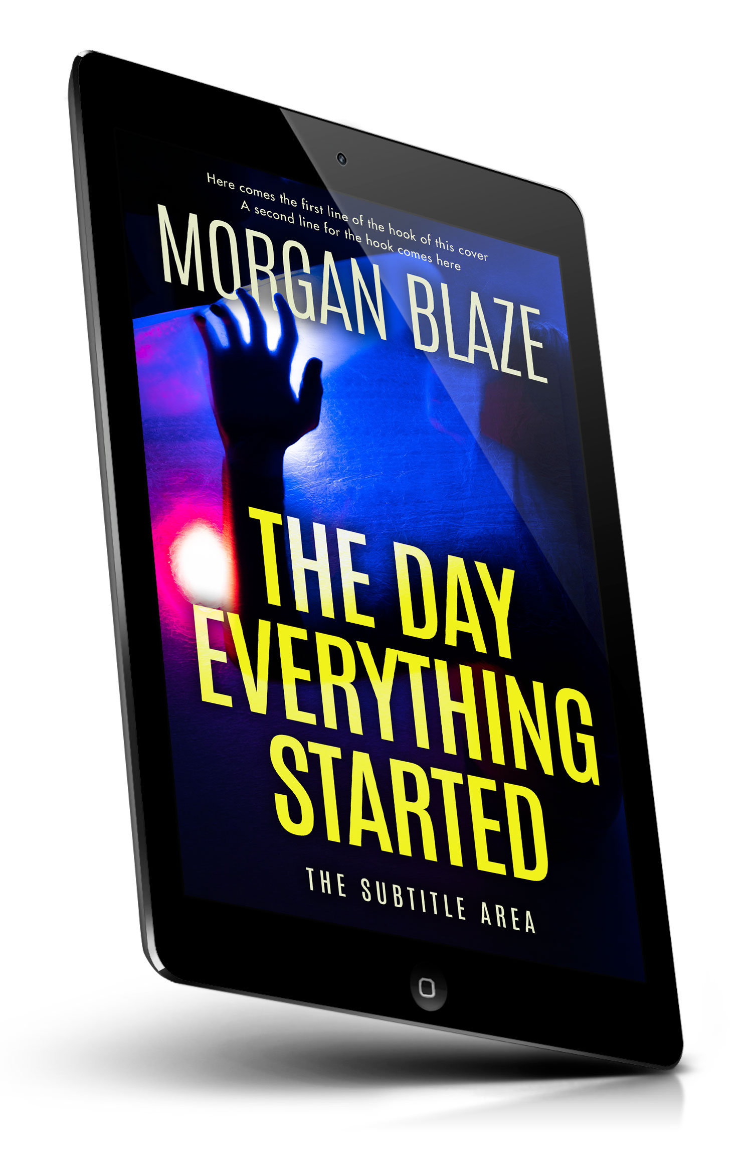 “Silhouetted hand reaching toward bright blue and purple light on a dark, moody background like a thriller book cover.”
