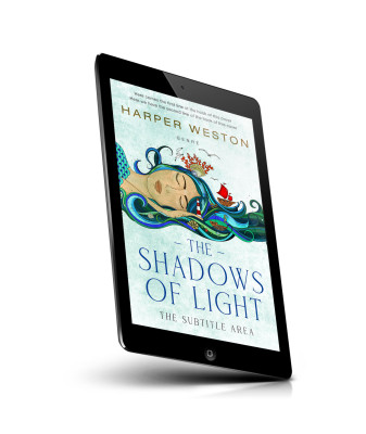 “Illustrated cover with a woman's face, ocean waves, ships, and a lighthouse.”