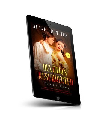 “A man and a woman in historical attire, embracing closely against a warm, glowing background.”