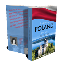 “A travel guidebook cover with a scenic view of a castle by a lake, surrounded by lush greenery, under a clear sky.”