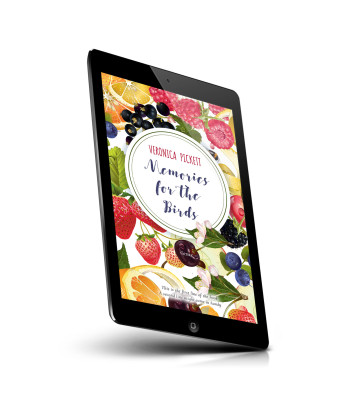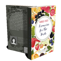 “A book cover with vibrant illustrations of various fruits and flowers surrounding a central circular area with the title and author's name.”