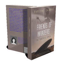 “A mysterious, futuristic landscape with a large, tilted structure and a hand reaching out in the background. Book cover titled "Friends of Invaders".”