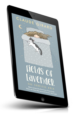 “A person sleeps in bed alongside a cat, under a starry sky and crescent moon, with "Fields of Lavender" written below.”